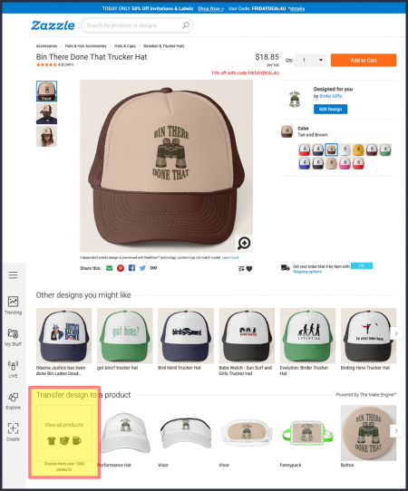 Let's click on the first item on the page, the Bin There, Done That Trucker Hat. This will bring you to the product page for this item on Zazzle.